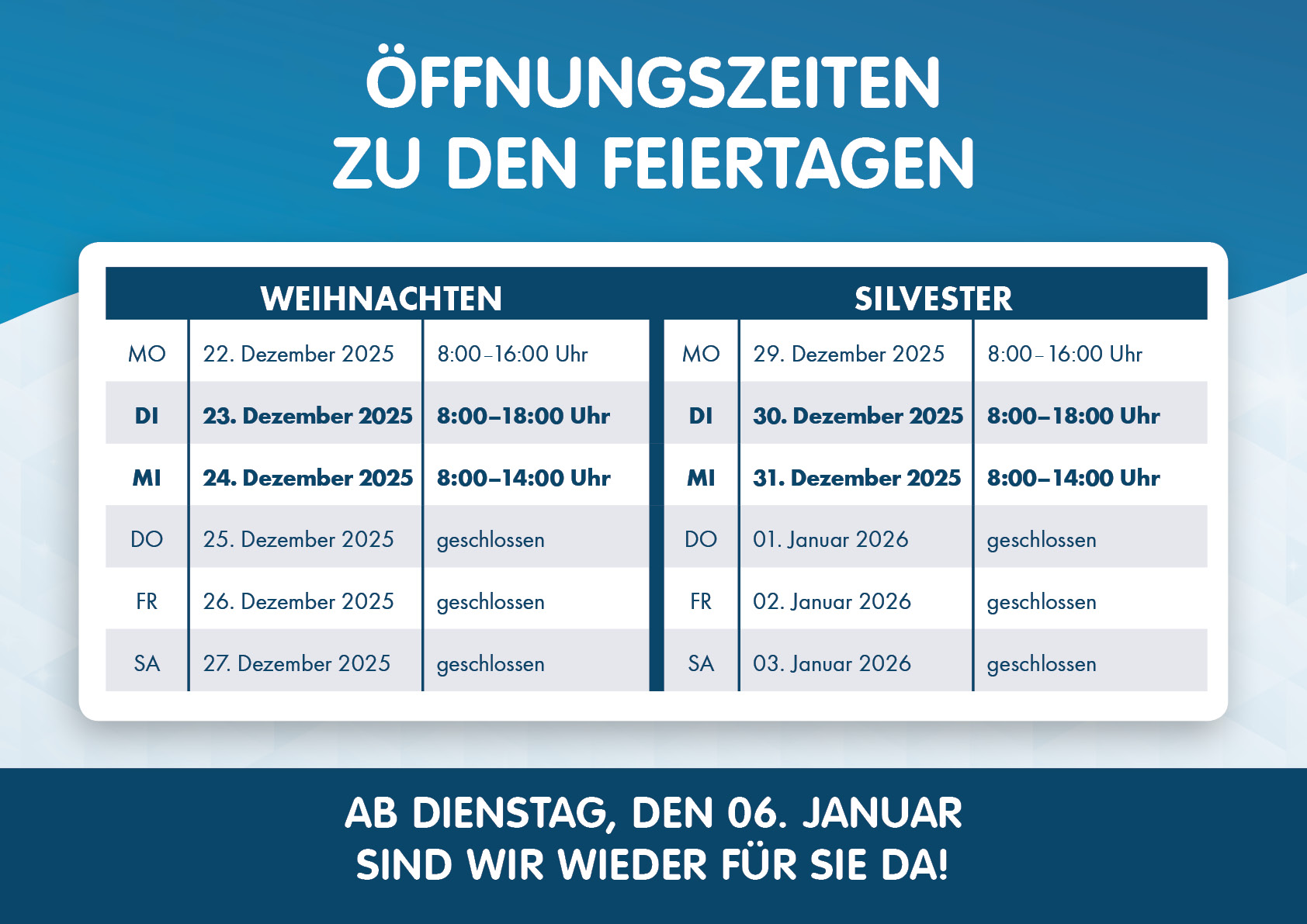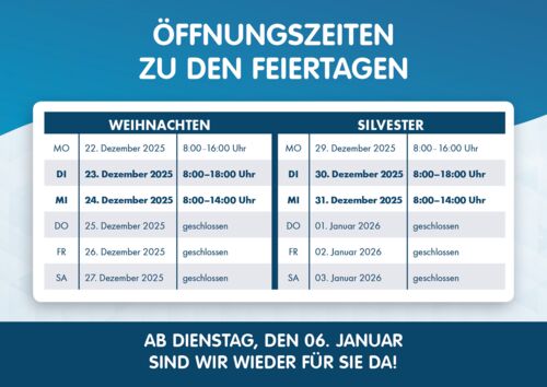 Mo. geschlossen / Di.-Fr. 8.00 -20.00 Uhr / Sa. 8.00 - 16.00 Uhr